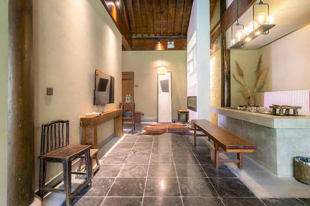 推开漆黑厚重的木门,房间内让人眼前一亮,挑高屋梁使得内部空间很大,家具和装饰品都是旧时的老物件,慢慢的年代感,独立的公共茶吧、牌桌和会客空间,很适合家庭活动、朋友小聚。