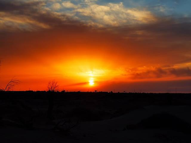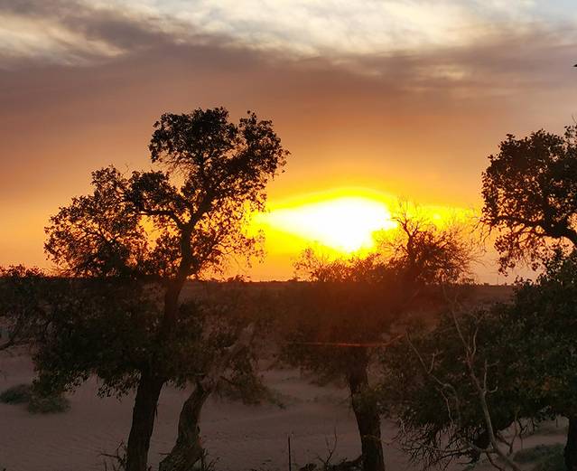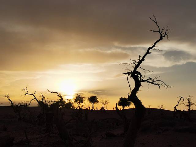 当夕阳把天空染成血一般的颜色时,胡杨干枯的树枝成为了美丽景色中的剪影了