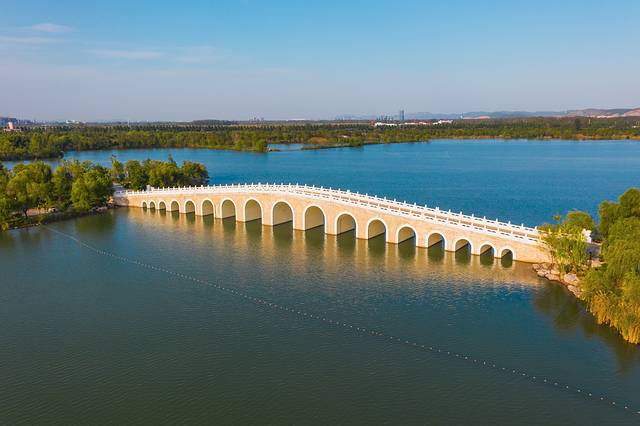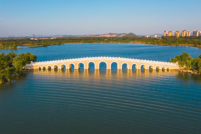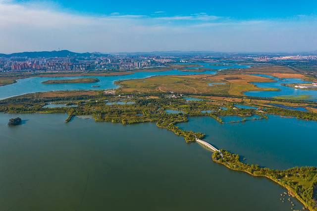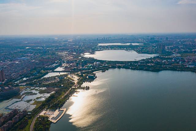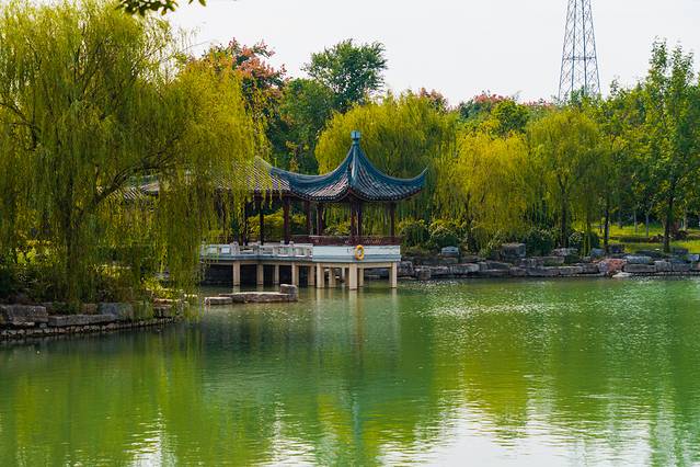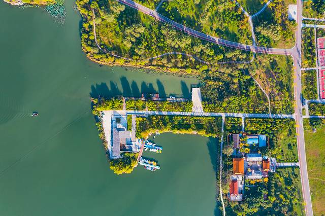 一座公园涵盖了湖堤春晓、芦获秋歌、缘溪泊芦、荷塘清韵、涵碧听风等22处景点,湖光倒映着天光,驾一叶扁舟,泛波而来,乘兴而去。