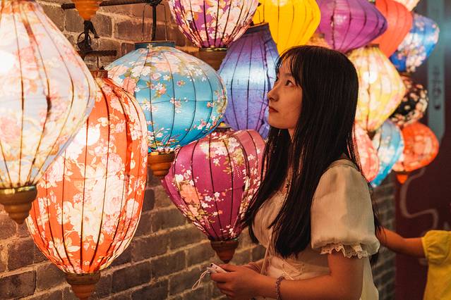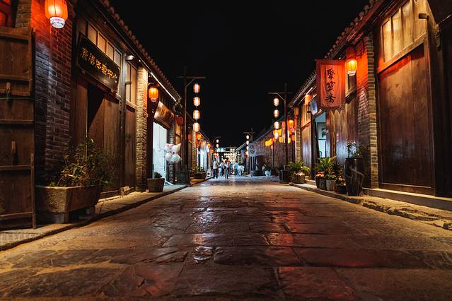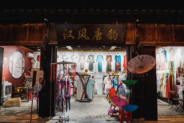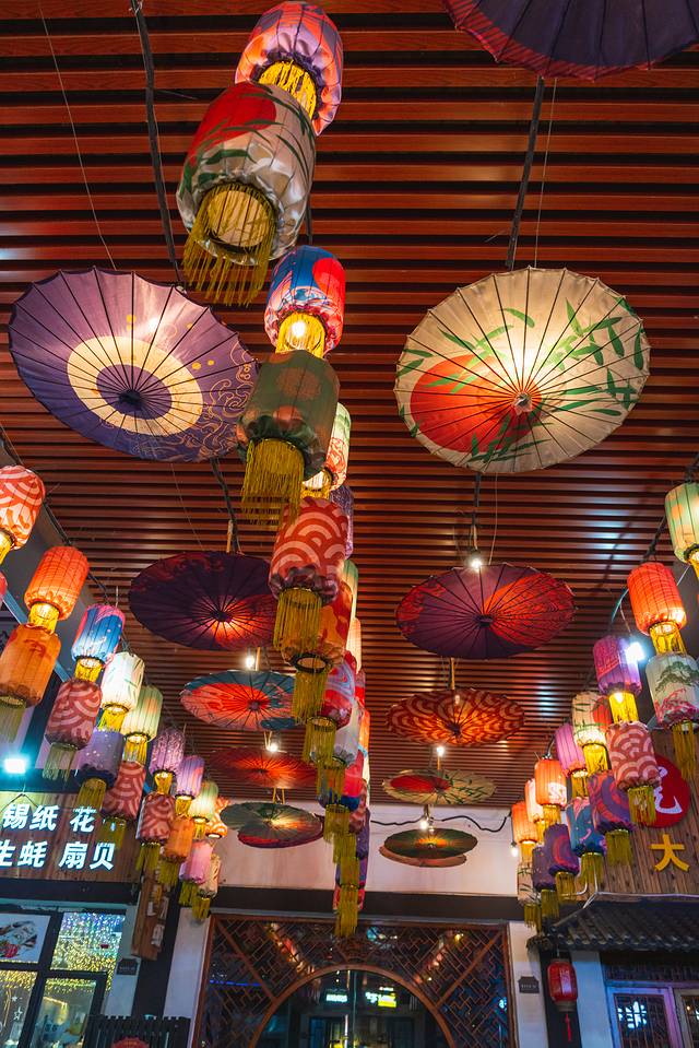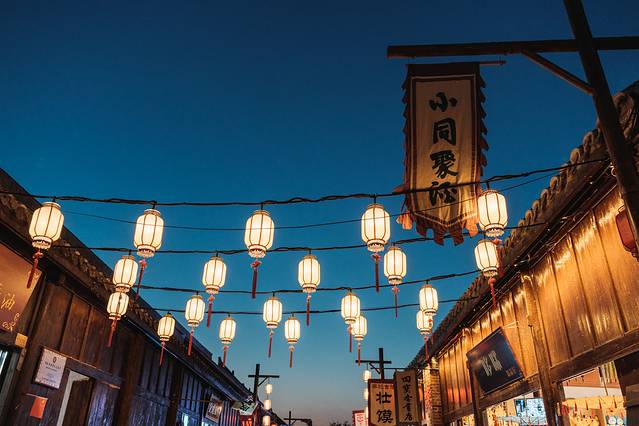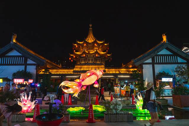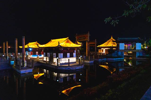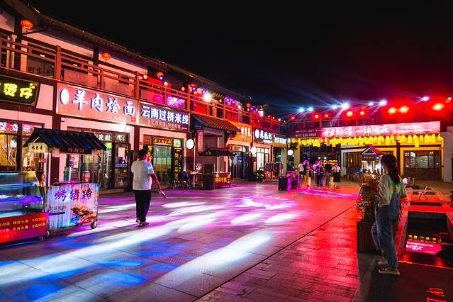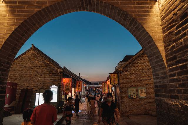 暮色中,灯影朦胧,将那层檐重栏、雕花斗拱的仿古建筑映衬得大气磅礴,勾勒出一幅隋唐盛世的神韵。巷弄里人流涌动、饭菜飘香,地道的小吃、巢湖居里的隋唐宴,三五声吆喝、孩子们的嬉闹欢笑交织在一起,过去、现在、未来在夜色迷离的光影里交融,运河通盛世,似是旧梦来。