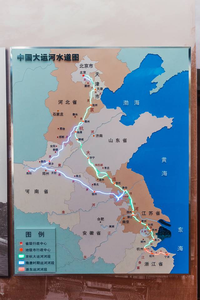 公元605年至610年,隋炀帝为加强对全国的统治,分三段、三次开掘隋唐大运河。隋唐大运河北起幽州(北京),南至杭州,全长2700公里,分为永济渠、通济渠、邗沟和江南河四段,连接海河、黄河、淮河、长江和钱塘江五大河流,历经隋、唐、宋三朝约六百年,史称隋唐运河。这条运河运营了六百余年的内陆水上航道,后因部分河道淤塞而衰落,取而代之的就是现在的京杭大运河。