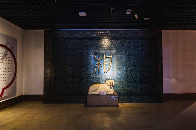 由博物馆一楼进入展厅,迎面可以见到的是古铜色照壁上,镶嵌的“相”字,呼应古代历史上对淮北为相城的称谓。照壁前有一尊石羊,是淮北的吉祥物,造型古朴、憨态可掬。原件是汉代的作品,国家一级文物,现在安徽省博物院展示。