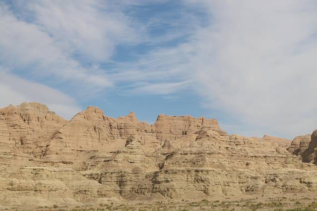 魔鬼城属于雅丹地貌,在大自然鬼斧神工长期作用下,形成了一个梦幻般的迷宫世界。由于风雨剥蚀,地面形成深浅不一的沟壑,裸露的石层被狂风雕琢得奇形怪状,我们并没有购买门票进去景区,因为去往艾里克湖途中一路都是这种地貌,所以没有必要购买门票进入景区