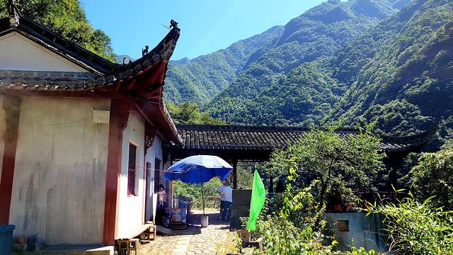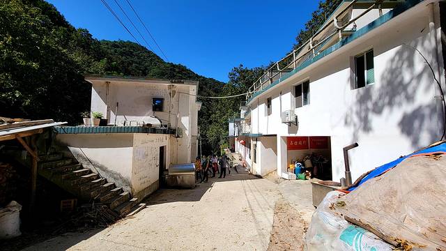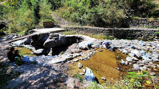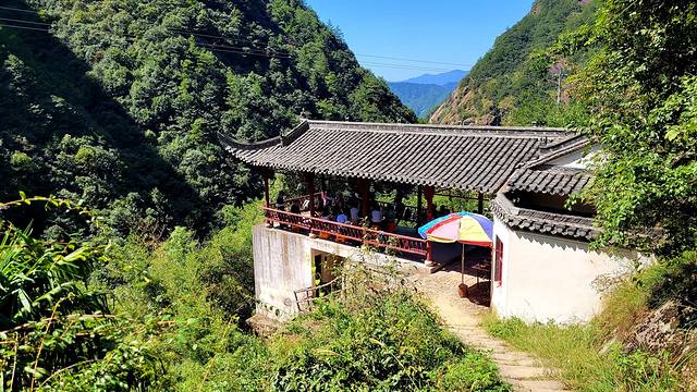 施茶亭这里是个关键节点,很多人在此短暂休息。我发现古道一路上有不少客栈和饮料摊,价格并不贵。出了施茶亭路有分叉,就要注意路线了,向右是古道,经过一个小瀑布,再向前可到“江南第一关”,然后就到景区伏岭镇门口了;向左则是新修的峡谷栈道。