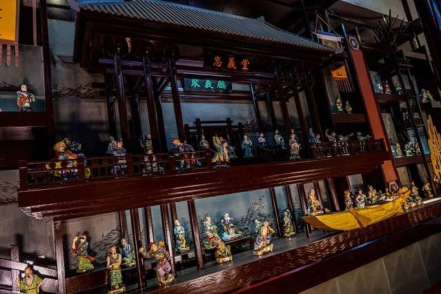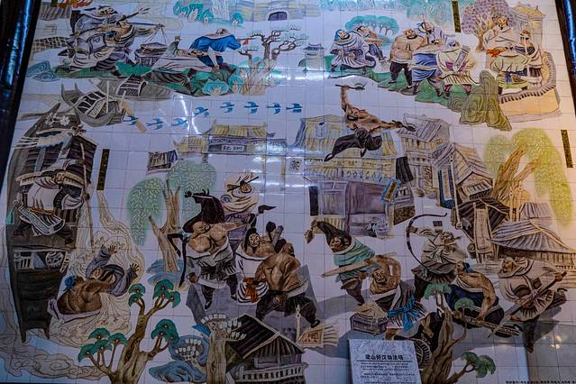 底楼大厅内陈放着梁山108位将领的瓷身人像,栩栩如生,姿态各异,两侧墙壁上镶嵌的大型瓷板画,描绘的正是当年宋江在浔阳楼上题《西江月》“反诗”的彩色石膏塑像,墙壁上有今人书写的宋江“反诗”。