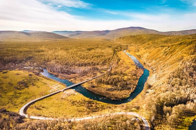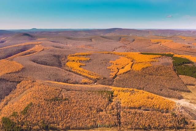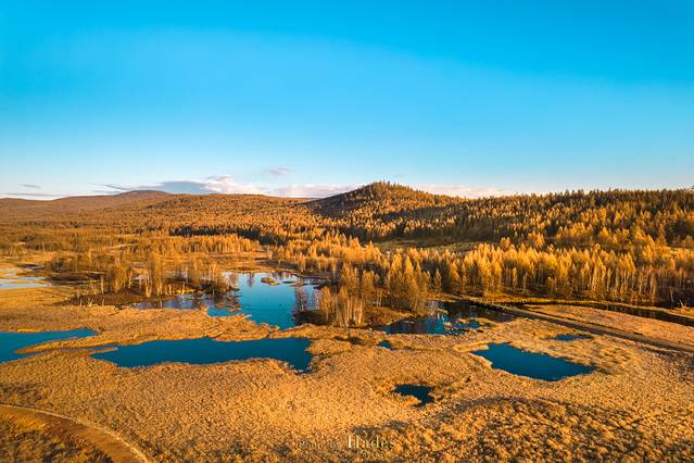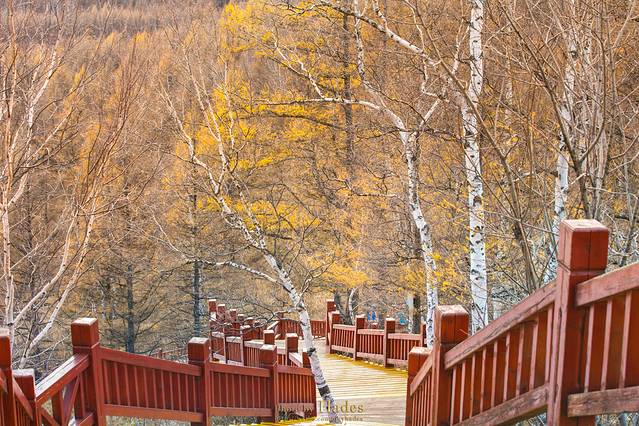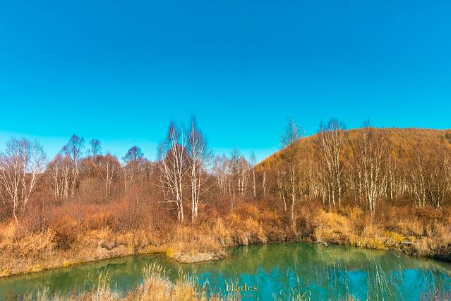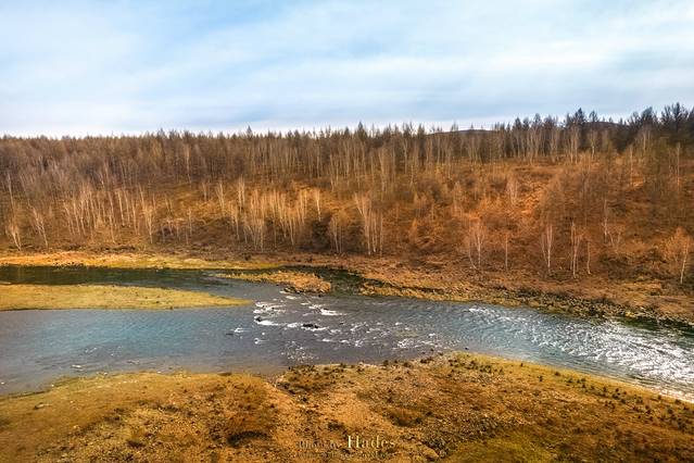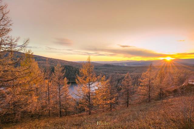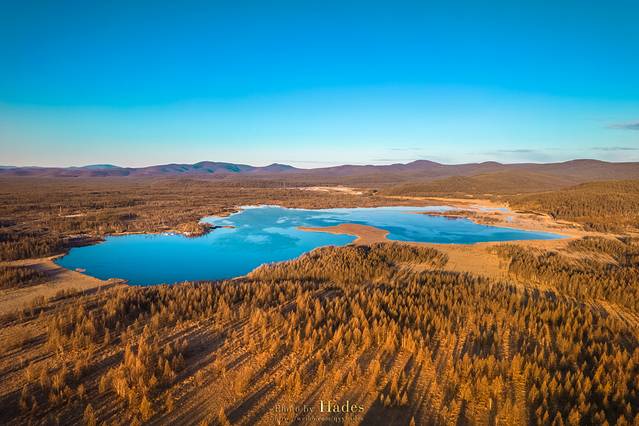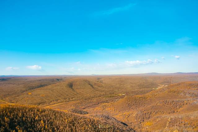 从乌兰毛都到阿尔山,沿途的景色逐渐从平坦的草原切换成了起伏的山峦,牧草灌木,也换成了枫桦松柏,金黄的色泽也更为浓郁。随着地势和纬度的变化,气温也在逐渐的下降。
