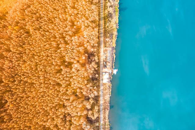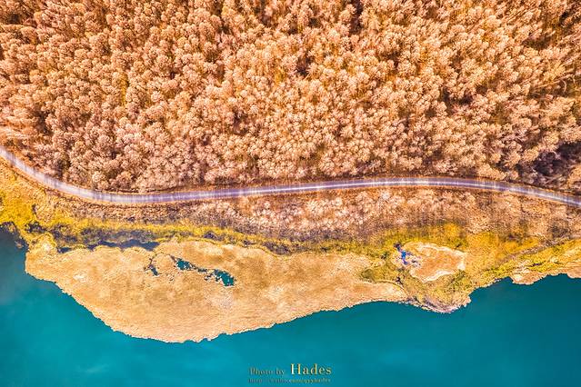 乌苏浪子湖周围森林茂密,水面平静清透,从空中俯瞰清新唯美。乌苏浪子湖也是观晨雾的好地方,如果早上来得够早,可以看到轻薄的晨雾飘于湖顶树梢,仙气儿飘渺。