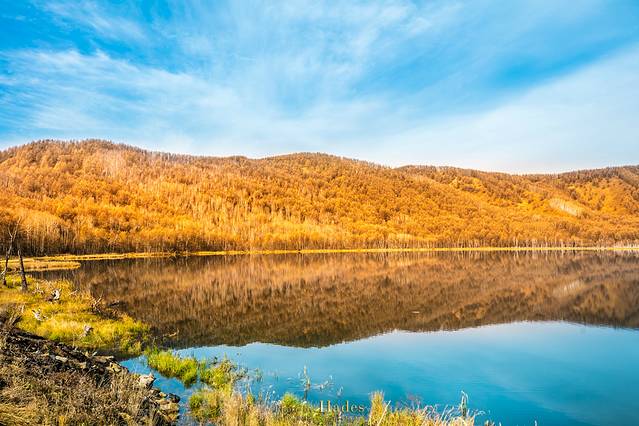 越往阿尔山国家森林公园深处走,周围的秋意便更为浓郁。到了明星景点阿尔山天池,这份秋日之美,便到了顶点。