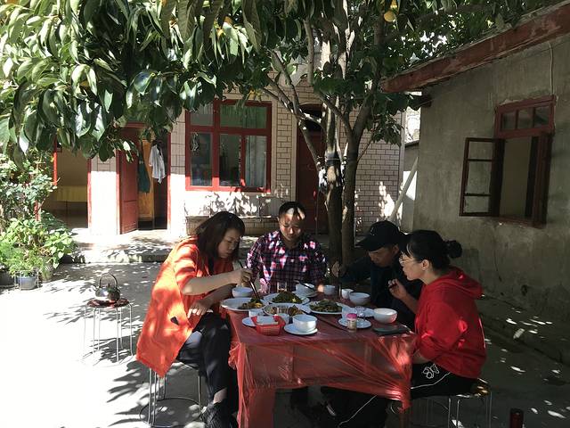 一个院子、一棵果实累累的果树、一张桌子,在树下吃着美食,昭哥说树上的果实落下来砸到他就好了,哈哈哈。