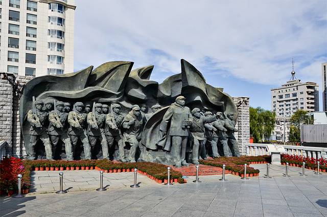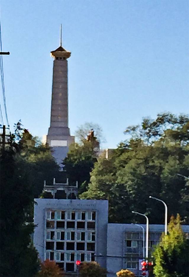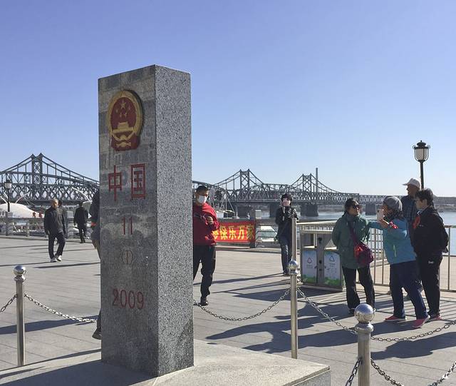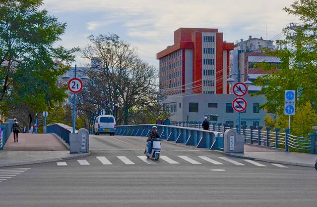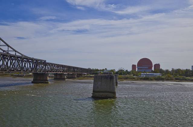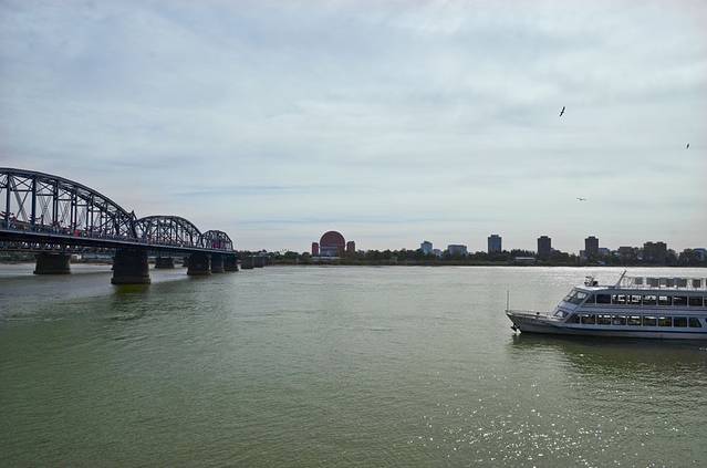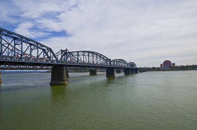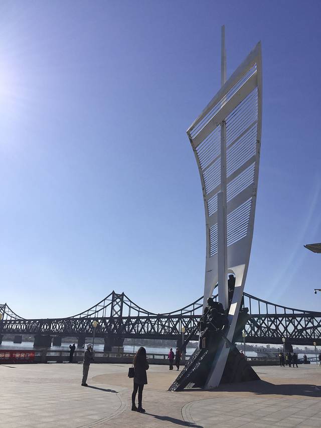 又去了鸭绿江断桥景区,江边的风更大,但这是市内最重要的景点了,历史意义也是无比重大,游人不少。桥下江边拍照,对面的新义州是朝鲜第四大城市,清晰可见,几栋楼房,其中还有没上玻璃的烂尾楼。
