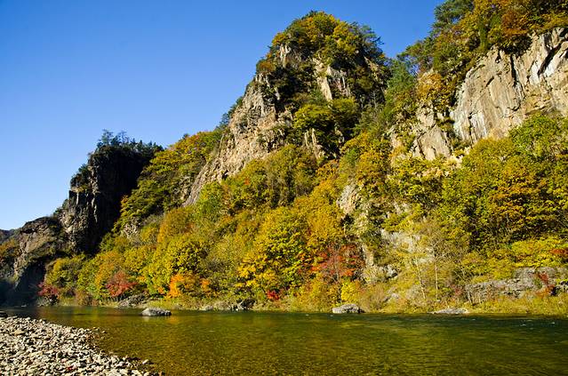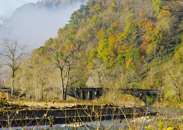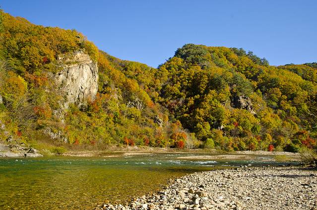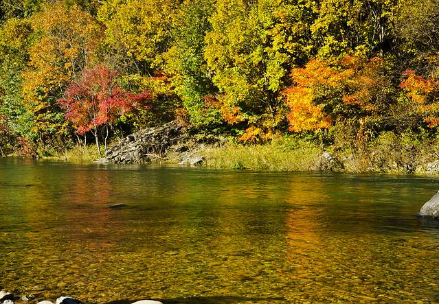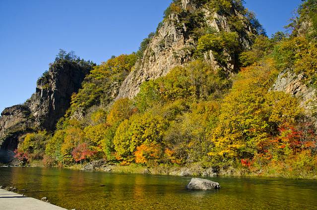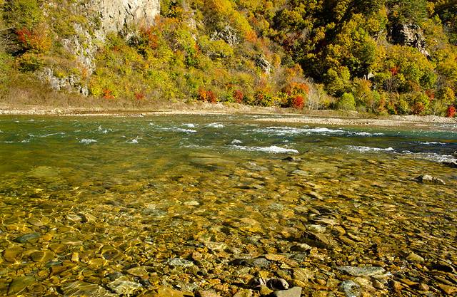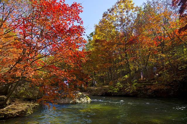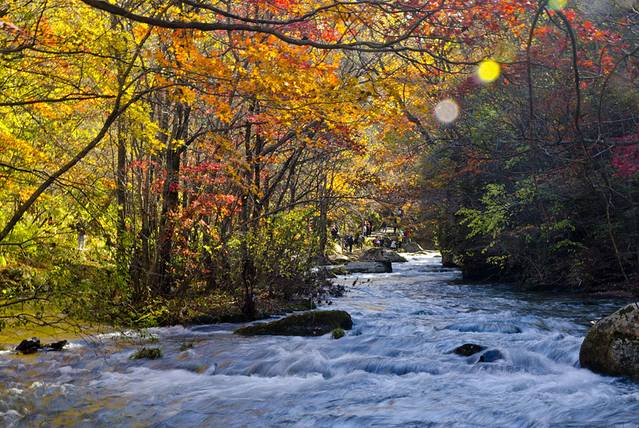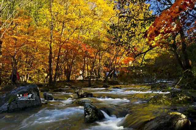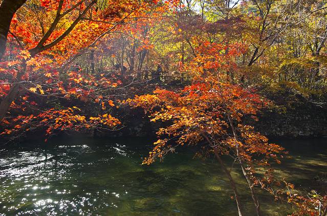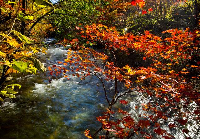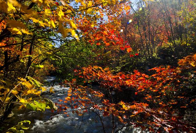 今天还是艳阳高照,一路向沟里游览,开头一段景色有点乱,过去这段在搞联英雄雕像之后的飞花岛时景色最好,机位也好找,小溪红叶全景入画。