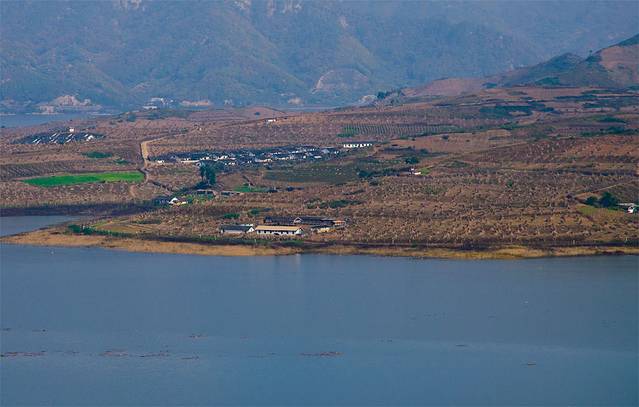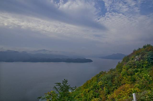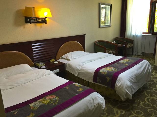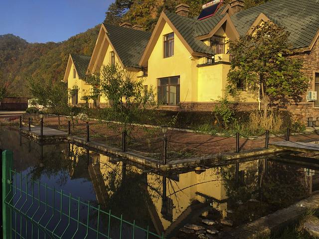 沿湖边走走,随便拍了几张便继续赶路,到达我们今晚准备下榻的俪园度假中心。大石湖老边沟景区是我们明天要欣赏的两个景区,也是我们此行的主要赏秋地,附近没有条件较好的住宿,全部是农家乐水平,服务不规范,不卫生,房间设备损坏,无法正常洗澡等等。我行前反复比较,想找一个勉强说得过去的住宿,最后找到了俪园,从页面上看感觉比其它农家乐强些,但还是没等入住就出现了不规范的问题,由于前一天的团因天气有雨推迟了行程,便把我的双人间挤没了,让我入住公用卫生间的房间,而且入住后发现俪园只是外观的小洋楼比其它农家乐漂亮些,其内里的设施和条件并无二致,价格还不低,好在他们承诺床上布草一客一换,但是否所有房间都如此就不得而知了。