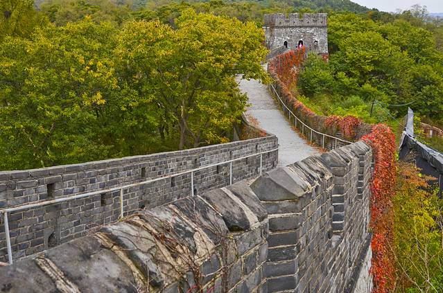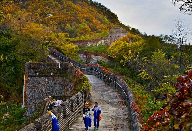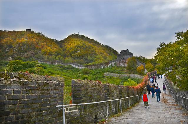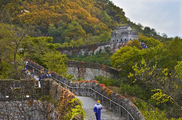 虎山长城的前一段较平缓,雕楼整齐,仔细看地面和城墙的砖有新有旧。最后一段就较陡俏了,那离朝鲜最近的“一步跨“也要登上山顶再下去一段路才能看得见,我还是算了吧,就在前面这段走走看看,拍拍吧。