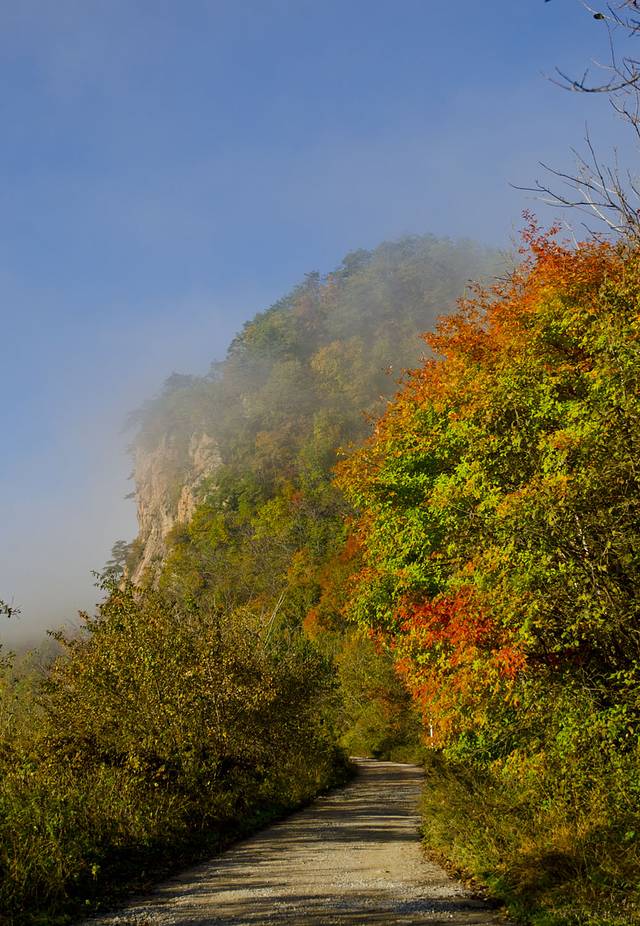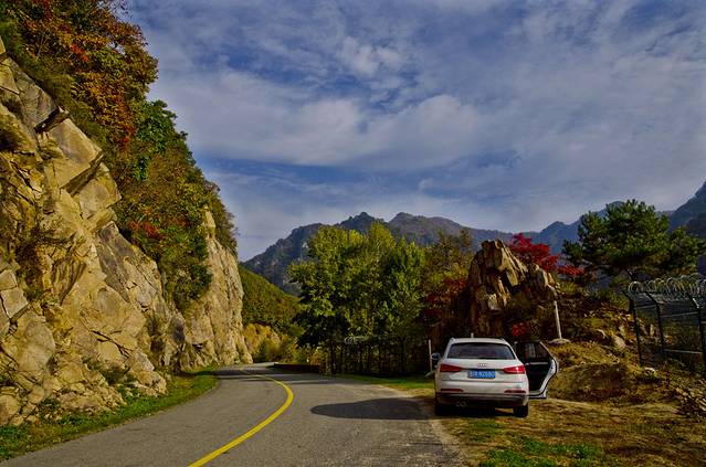 沿本桓公路东行一段,再向南一点便是大地森林公园,本是个不收费的景区,但今年有人上来收费30,不知是个人还是集体行为。开车进景区再收30。可以一直沿土路开到最里面的瀑布,由于今年雨水多,瀑布还有一点水量。里面的其它景色是没什么,整个公园只有一进门后的一段还有些红叶欣赏,远不如网上别人游记中记录的那么漂亮,看了大石湖和老边沟,这个其实不必再来了。