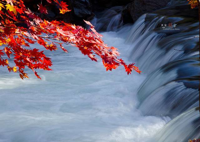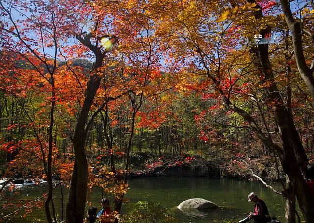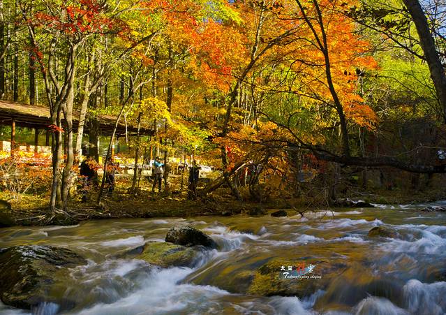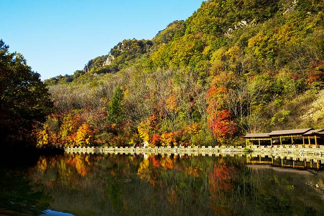 大石湖是太子河的发源地,五湖四瀑阶梯式排列于陡峭的山涧之中,每到秋天,红黄绿相间的枫叶宛如一幅五彩画卷从天而降,与湛蓝清澈的湖水相得益彰,让人心动。
