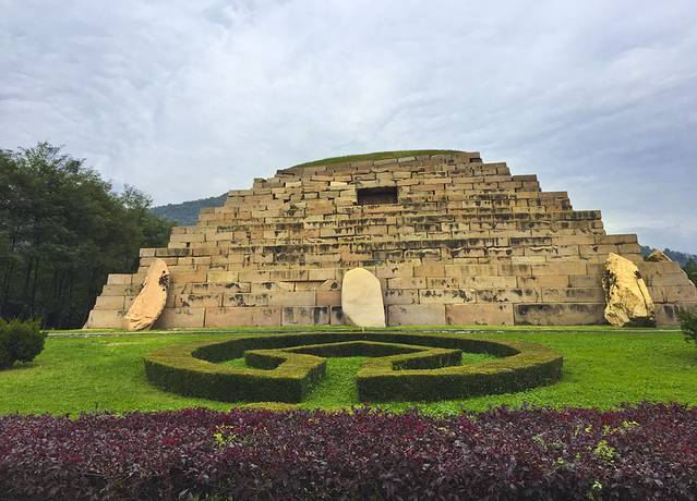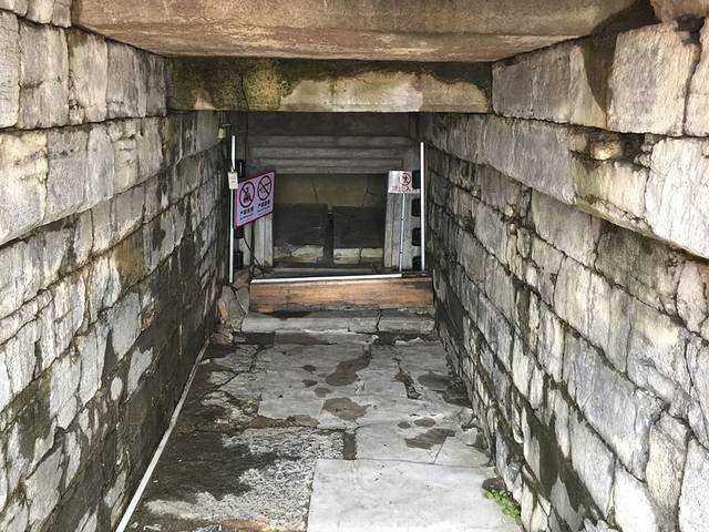 买了联票后,先参观将军坟。被誉为“东方金字塔”将军坟,推算为公元四世纪末五世纪初高句丽王朝第二十代王长寿王之陵。整座陵墓呈方坛阶梯式,高13.1米。墓顶面积270平方米,墓底面积997平方米,全部用精琢的花岗岩砌成。坟阶七层,每层由石条铺砌而成,每块条石重达几吨。第五阶有通往墓室的通道,盖棺石板重50多吨,每面三个护坟石各重10余吨,其势宏伟壮观。这二十代王活到了98岁,当年是奇迹,所以叫他长寿王。