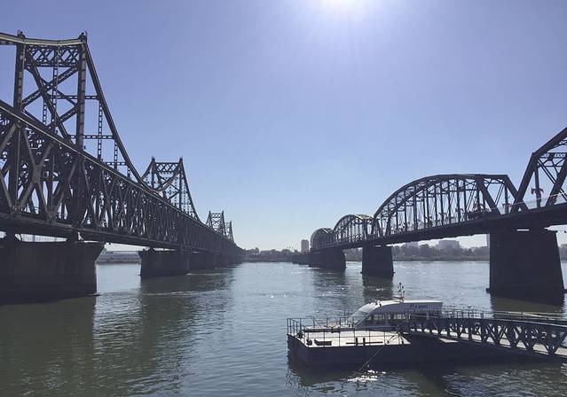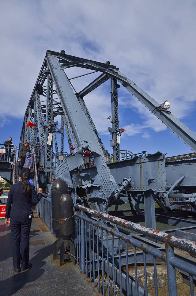 上桥慢慢向断头走去,当年炸断的痕迹明显。鸭绿江断桥该桥原为12孔可开闭式铁路桥,总长944.2米,宽11米,从中方数第四孔为开闭梁,以四号墩为轴,可旋转90°,便于过往船只航行。中间的桥敦上可清楚看到那些供桥身旋转的齿轮,好像这种设计断桥是唯一。