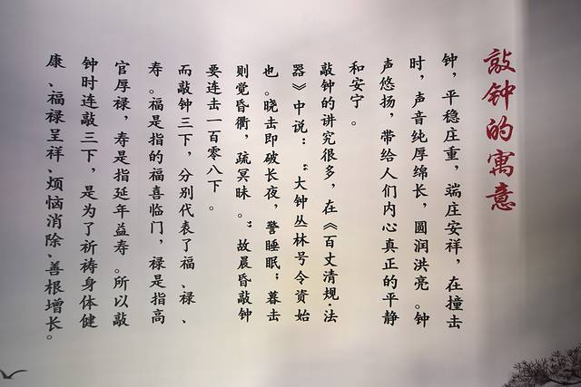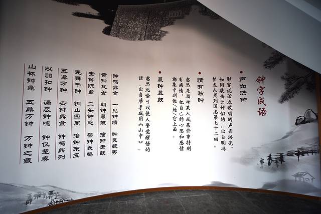在大钟四周墙上,展示着与钟有关的文字,钟不仅是报时工具,也是文化的载体,穿过历史的尘埃,传播着超越时空的声音,记载着一段段兴衰荣辱的故事。
