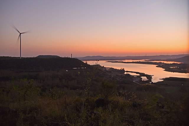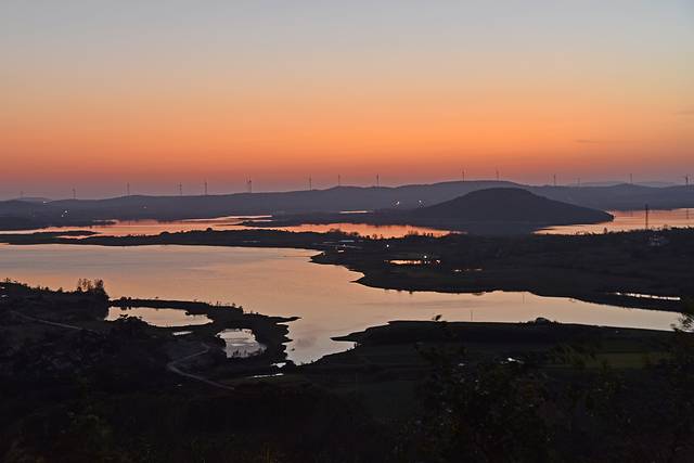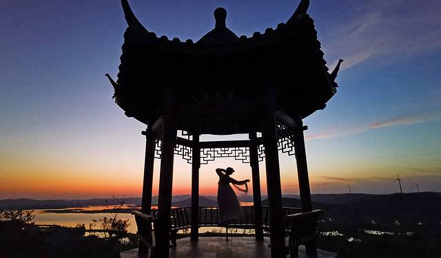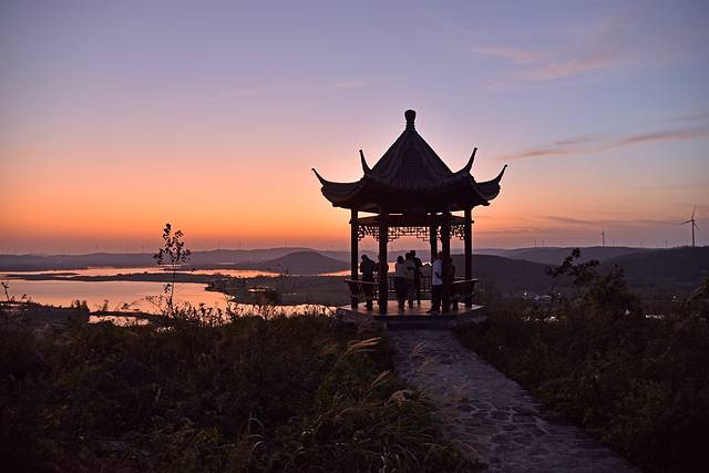在杨郢乡,还有一处非常适合拍照的打卡点,离开界牌村赶到这里太阳已经落山,只剩下余晖映照在天际线上,倒映在湖水中。观景台位于志凡村高山组境内,因此取名高山观景台。最佳观景位置建造了一座亭子名为“三乐亭”,可以俯视屯仓水库全貌。