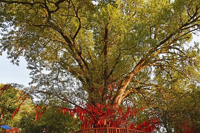 过去,这里有一雌一雄两棵古树,50年代大炼钢铁时雄树被砍,剩下的这棵雌树也是命运多舛,经历两次大火,侥幸保命。近年来,人们越来越重视对古树的保护,修建了台基护栏,清除朽木填补树洞,在护栏之外设置了香炉,安排专人看护,让古树重现生机,让后人也能有幸看到这棵活化石般的银杏王。