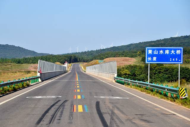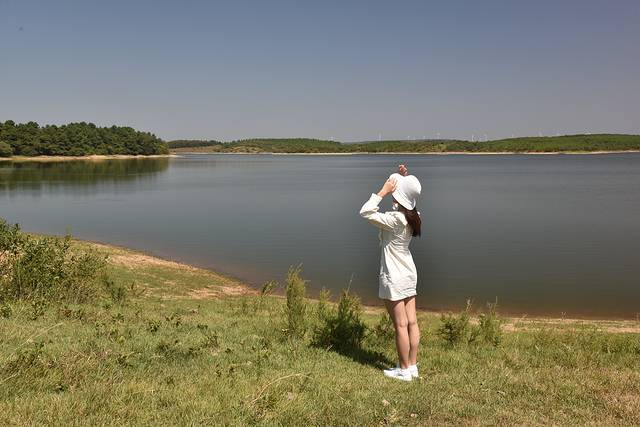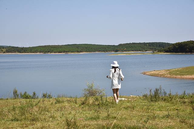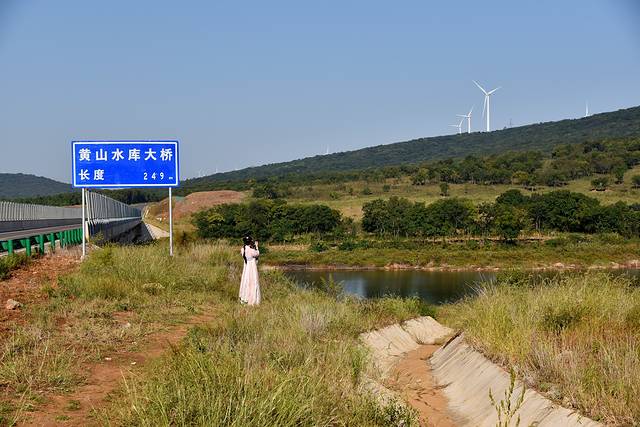 江淮分水岭,这条自驾黄金线的道路刷上了三种颜色,给一路的风景又增添了几分色彩。离开凤阳县,进入定远县境内,来到凤阳山南麓的黄山水库,我们在桥头停下来。虽然不是什么著名景点,但有山有水的地方就有风景,路边山坡上醒目的大字“绿水青山就是金山银山”成了拍照打卡点,我们看到很多自驾的游客路过都会停下来走走拍拍,自驾游的乐趣之一就在于此。