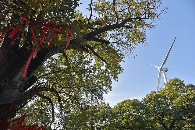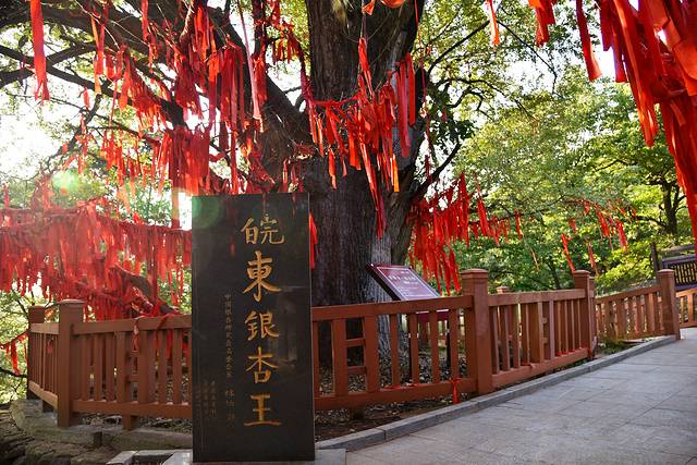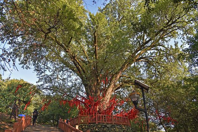 离开明光黄寨草场,自驾到月牙湾生态园享用了一顿当地农家特色的午餐,我们继续驱车来到来安县杨郢乡宝山村,亲眼目睹皖东银杏王的风采。沿着台阶走上山坡,一课巨大的银杏树呈现在我们眼前,树高20多米,一亩多面积都在树冠的庇护之下。树下还长出了几棵小树,有大有小,组成了四世同堂的场面。据专家推断,这棵古树的年纪在1500年以上,在皖东地区是当之无愧的寿星,因此被称为“皖东银杏王”。