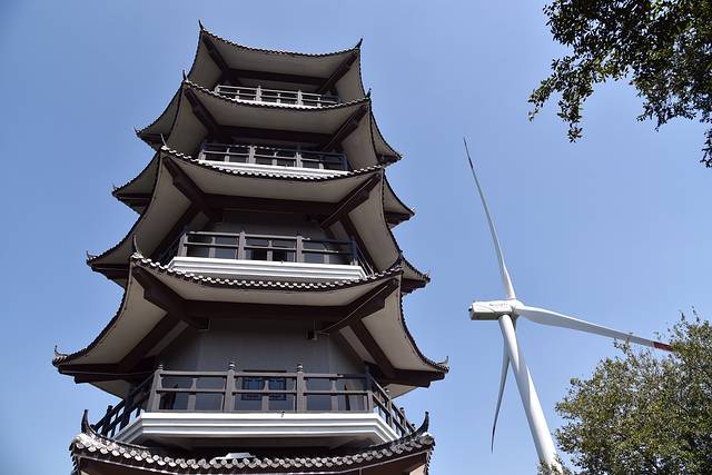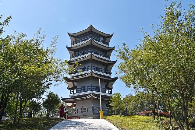 娘娘顶因娘娘庙而得名,距今已有1500多年的历史。附近的百姓经常来娘娘庙进香,香火之盛不逊龙山寺,直到解放前夕,军阀为了在司令部旁边盖大戏台,拆掉了娘娘庙,只剩下墙基遗址在龙山顶上。如今娘娘顶上建成了一座五层宝塔,也是一座位置绝佳的观景台。登高俯瞰,远处群山叠嶂,四周田地池塘,风车迎风舞动,脚下山林茂密,山间公路曲折蜿蜒。