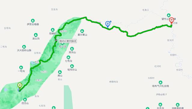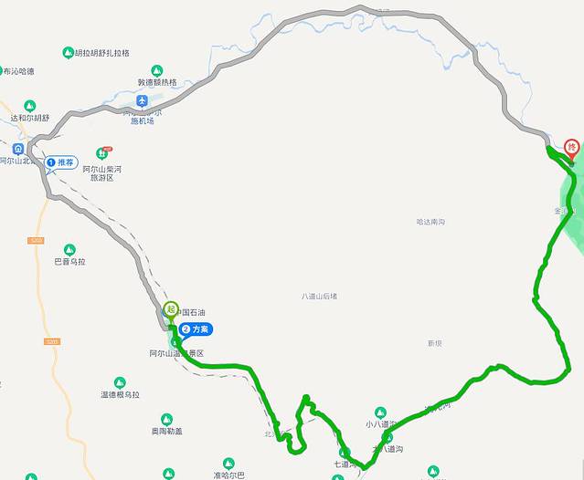 去往阿尔山森林公园。阿尔山市内还有网红火车站、温泉博物馆,北侧5公里处有五里泉,记得带水桶去打水,更远往机场方向,到地质公园博物馆旁边有玫瑰峰,这些都是小景点。往阿尔山森林公园有两条路,第一条是大部分熟知的X407(下图灰色路线),这条路没有完全修通,还有7公里的只有路基的路,都是碎石子和炮弹坑,比较考验车。还有一条是不知名的乡路,从白狼镇往东北方向走,这条路比较好走,宽度正好两车,水泥路虽然也比较破,但是坑都是小坑,SUV不需要减速的那种,全程80以上可行,百度可直接导出来,高德只能选择骑行才能出。到白狼镇拐向乡路之处,有防火站需要登记,中途还有一个一样要登记,不需要提前办理防火证。从阿尔山市走时间上两条路可能差不多,从机场走则X407更近些,这条乡路的终点其实也是金江沟温泉附近。