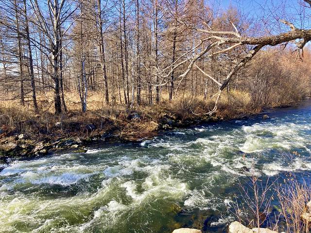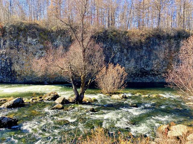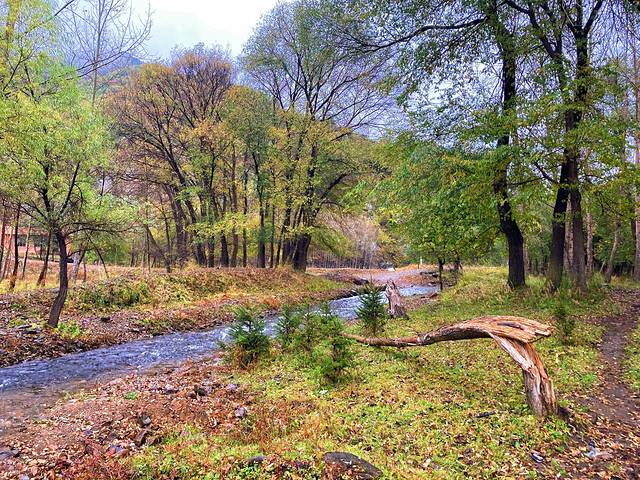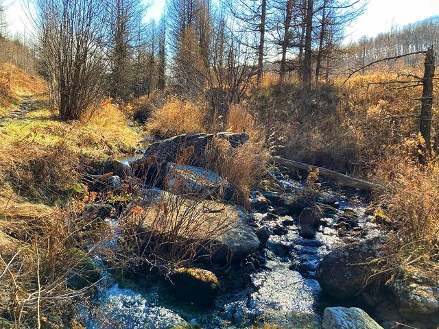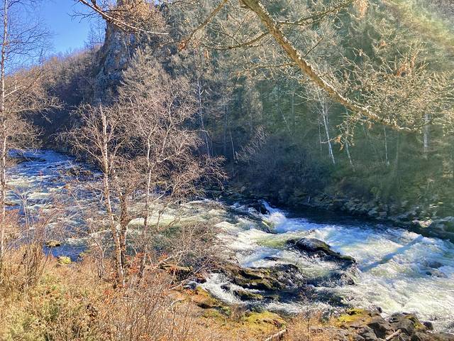 有三个潭而得名,三潭峡+地池是个单独的线路。这里的水流比较湍急,水量比大峡谷大很多,但三个潭并不明显,看上去只是河道的一部分,冬天河道部分结冰是最漂亮的时候,其余时间这样的景色在各地都比较多见,景区靠近河的部分只有前半,后半是穿行白桦林,当然此时也只剩下秃树林了。