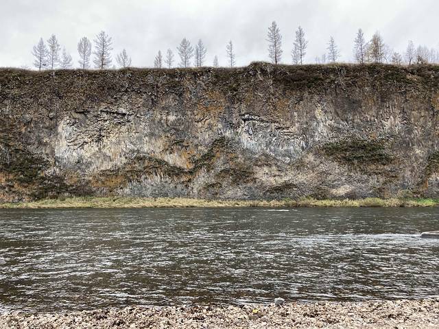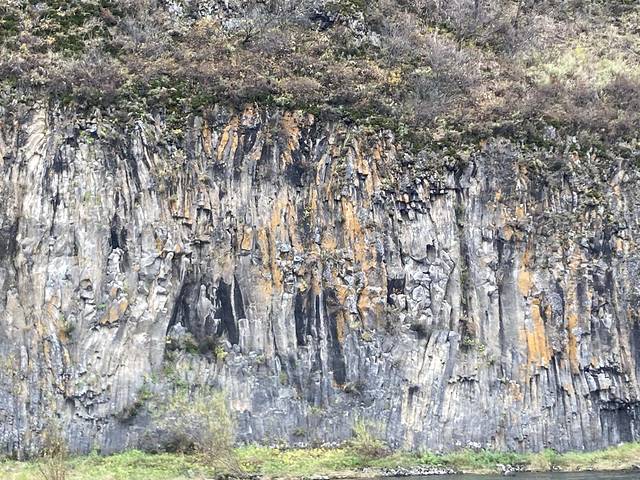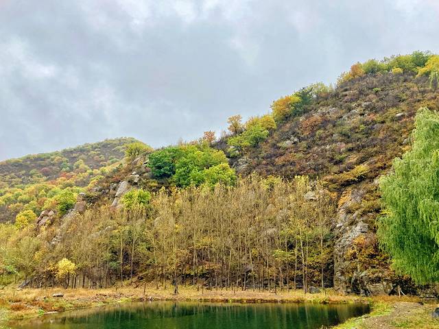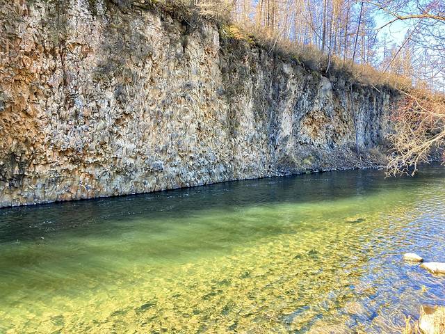 镇子南边方向,去往十大湾顺路,其实在柴河的河湾有好几处地质都差不多,只不过这里位置较好,导航会到达叫创业村的地方,河道对面可以看到石壁,高约10几米,表面凹凸不平和植被造成的阴影颜色变化,自行想象画面。