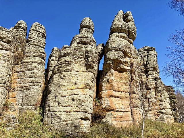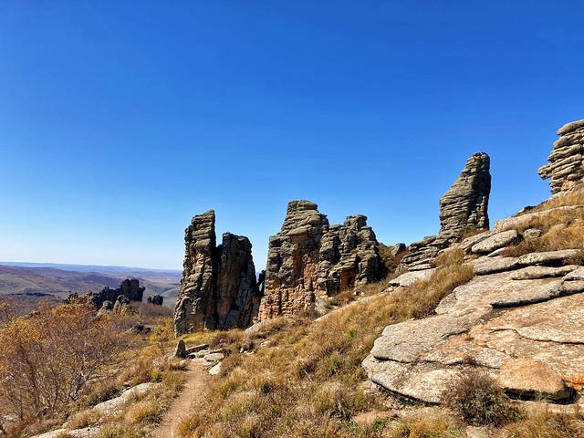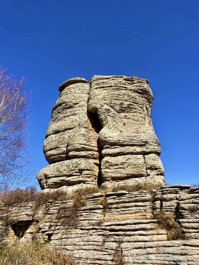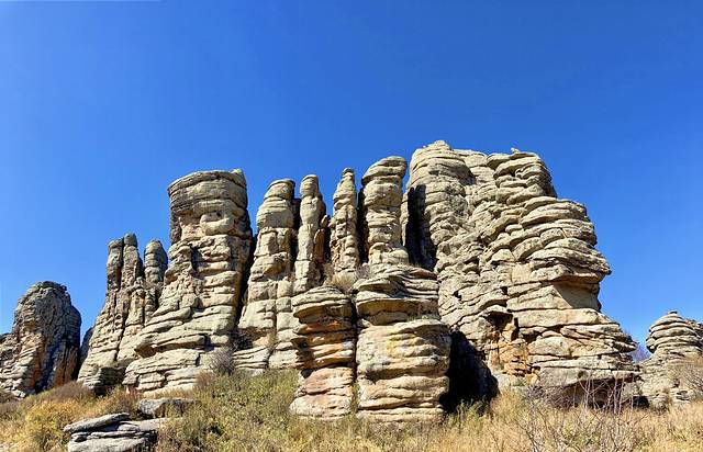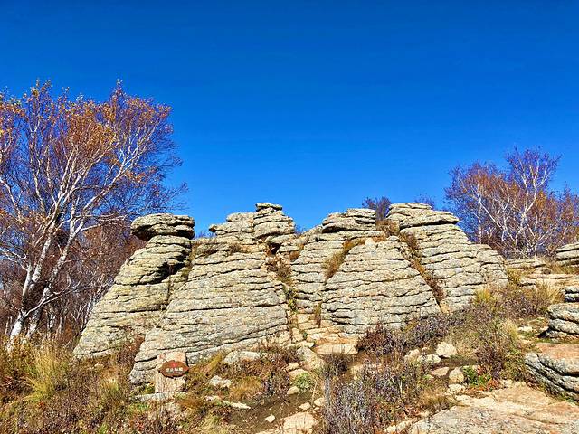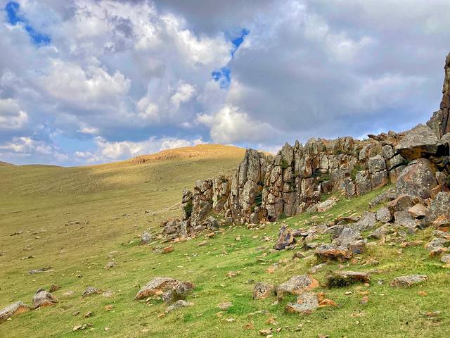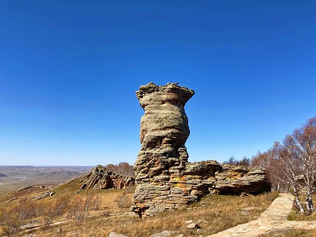 也叫克什克腾石阵,阿斯哈图是蒙语 “险峻的岩石” 的意思。石林在较为平坦的丘陵地带,达达线的尽头,这里的地貌主要是冰盖冰川运动造成的,石阵孤单的分散矗立在丘陵上,看起来像是一层一层石片堆叠起来。