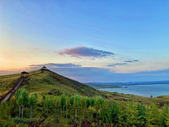 又名同心天池,就在镇子的最北端,是一个比较大的湖泊,湖里搞了养殖。有土路可以环湖一周,距离比较长,路宽只有一车,但只能越野可以走,有大坑会托底,路况十分颠簸。路至湖的背面,是大片的树林可以通到山脚下。此外,顺着公路往北走,地图上有个叫望牛山赏心峰的景点,是湖北侧山顶上的观景台,上山开大概10分钟到达防火站就是了。栈道一路通道山顶,视野很不错,且山后面还可以看到弯曲的柴河。