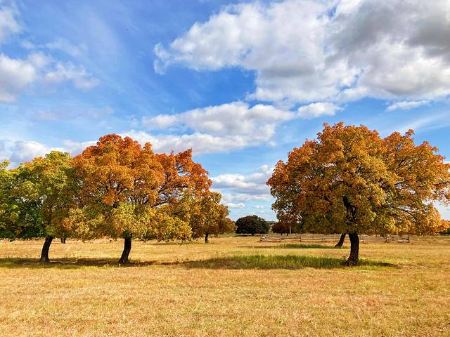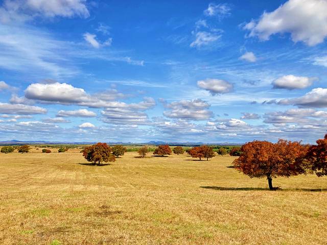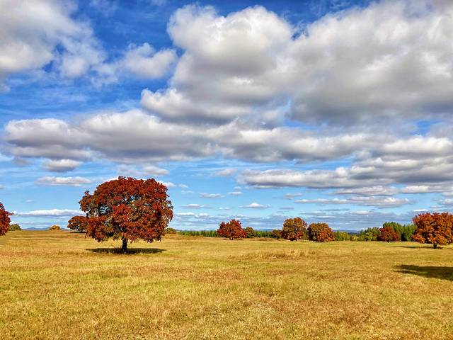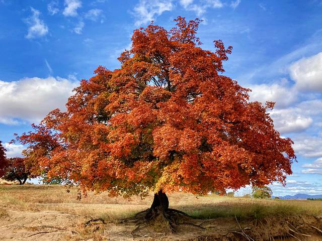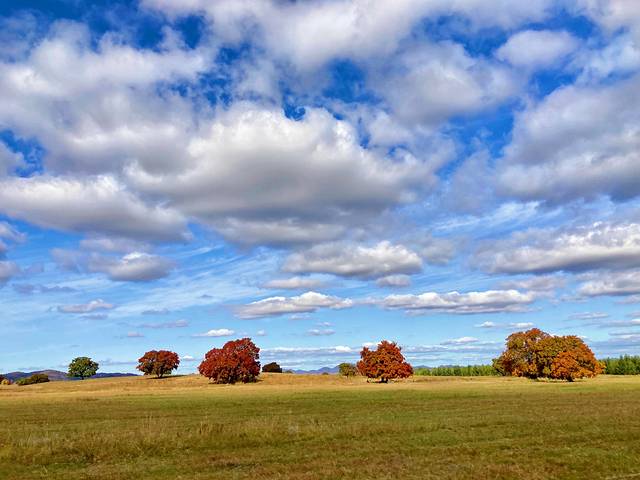 是个比较冷门的景点,时间为十月中旬之后比较好。这个地区的景色类似于非洲大草原那种稀树草原的风光,不过最妙的是,树是五角枫,秋天之后就会变成红叶,远观则是一个个红色的小球竖立在草地上。景区内并没有什么游玩的项目,骑马射箭不如草原,基本是摆渡车去看看风景,中心地带的游客中心有不间断的表演,也可以自己往深处走走,寻找一下比较红的树出片。