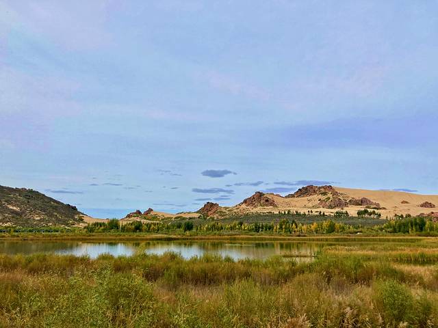 景区分为三个区域,只有境漠线比较好玩,沙地越野、摩托、骆驼等项目,因为除了沙漠区其他地区的景色也很一般。境水线只坐小火车看看就行了,停三个地点,第一个看看绿洲和远处的沙山,第二个是湖有点类似芦苇荡但是很小,可以划船射箭,第三个是个人造的小庙。境山线只能坐摆渡车,10分钟不到就上到一个平台,四面环山,这里可以不坐车回去,直接爬到旁边境漠区的沙丘上去,到最高处看看风景。最终这只是一个比较休闲的景区,并且有小木屋和集装箱可以住宿。