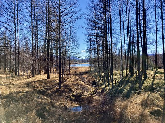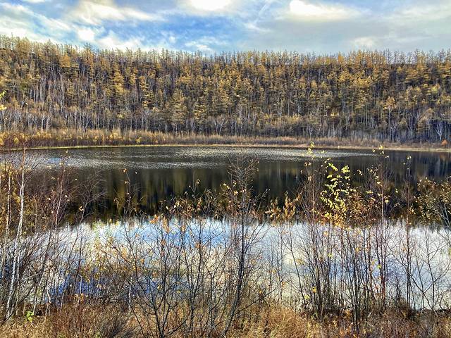 三潭峡后一站,看完直接回服务区。比较小的一个池子,是火山熔岩冷却收缩凹陷而成的一个火山湖,是典型的玛珥湖,由于低于相对地平面得名地池。由于气温较低,池子一半水面结了薄冰,木栈道绕池一周,山体上基本都是针林。