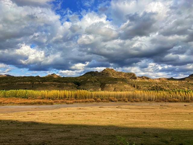 现在的九曲湾虽然还开放,但也过了季节,景区内和周边的草都被收割完毕了。坐越野车拉到山丘顶部,是看九曲湾视野最高的地方,但角度仍不够好,只能远处隐隐约约看到一点河道,还是必须航拍的地方。山顶有滑草滑梯可以直接下山,但和骑马一样都已经关闭了,旁边的草原拦起来,是牧民的地盘不让下到河湾。基本上这里就是看个日落,时间算好,30分钟基本可以解决所有问题。9月底的草原非常寒冷,到傍晚低于10度还有大风。