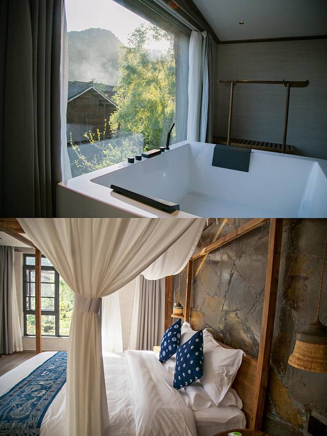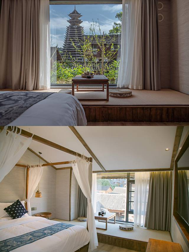 每间房的窗外都有不同的森林一隅,有的是山林云雾,有的是侗族鼓楼。