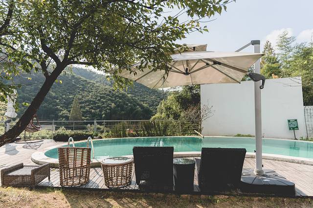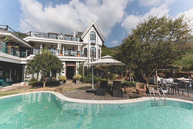 十八迈有一个月牙形的游泳池,颇有设计感,这也算是一大特色,我走来泳池边上看着这栋有设计感的别墅,据说是因为从高铁一路到这儿,正好是18英里,所以取名为十八迈。
