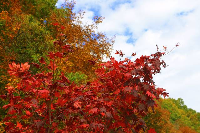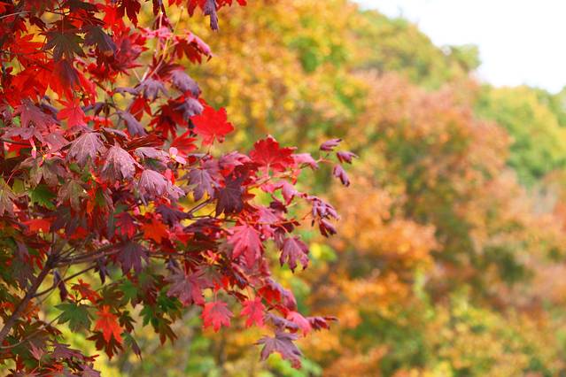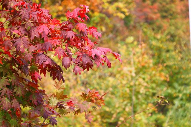 沿着山路两侧排列着触手可及的枫叶,这里的枫叶,除了深沉透彻之外,还拥有一种飘逸的美,每棵枫树都红的各有不同,红的层次分明。