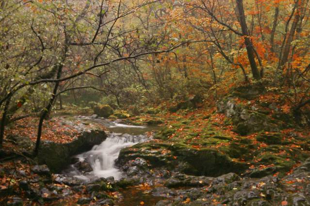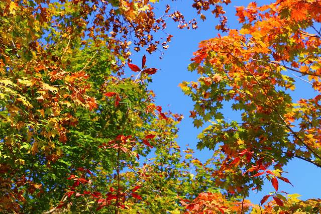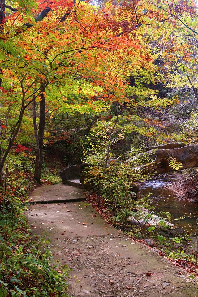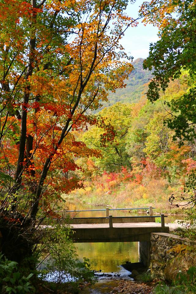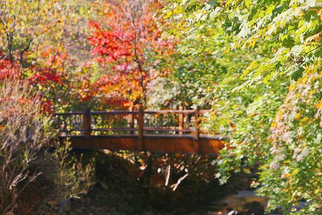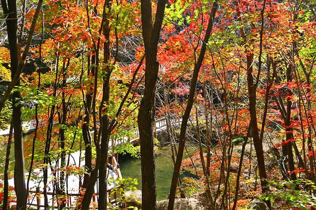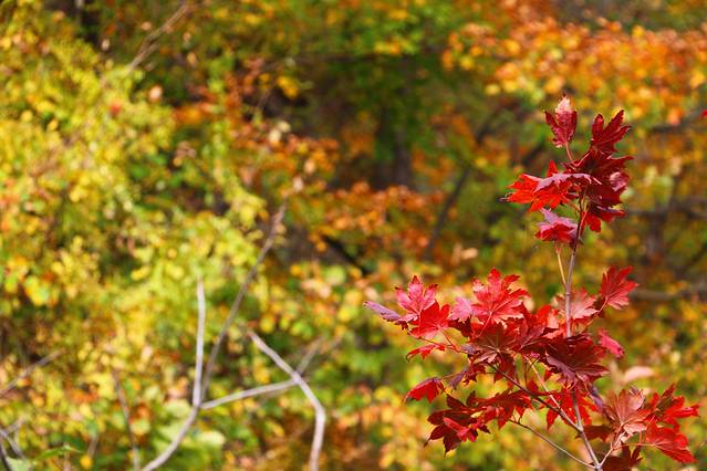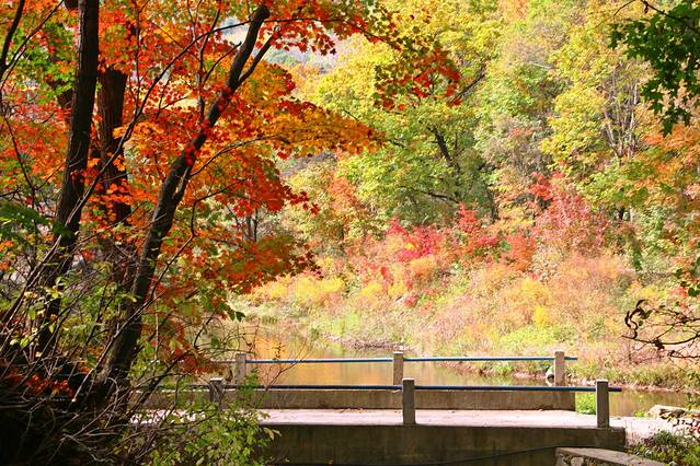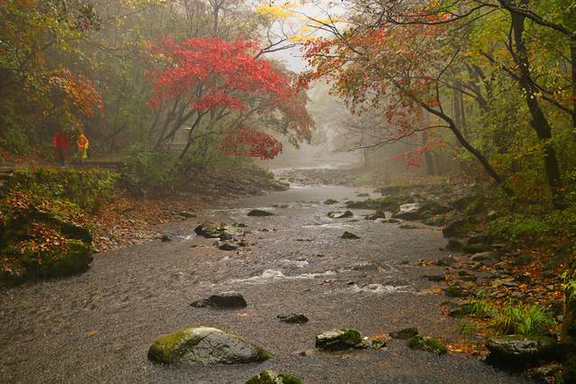 秋天一到,整个林间打开了七彩的阀门,溪水两岸枫林成荫,红黄绿相间,颜色或深或浅,沿着山峦,盘旋曲折,像一条浓墨重彩的多彩丝带,缠绕着溪水,映照的山峦……