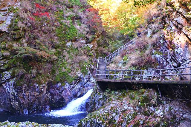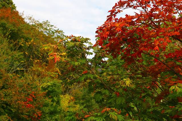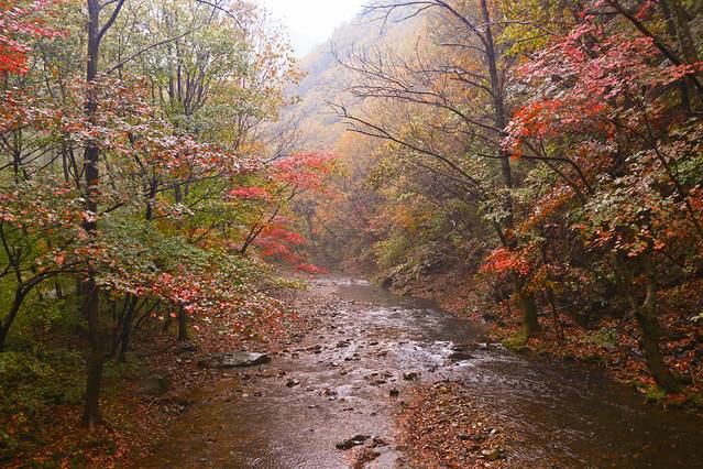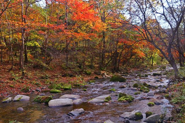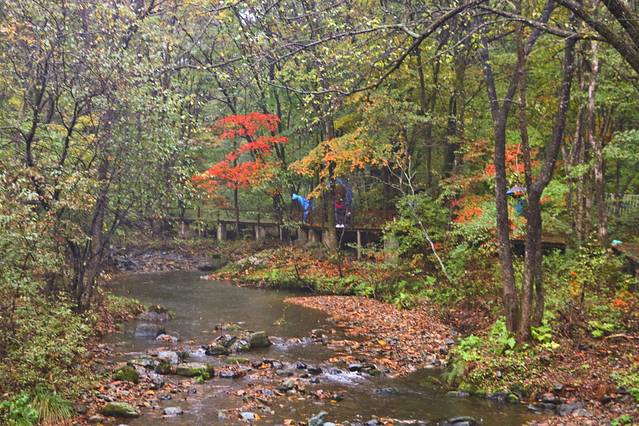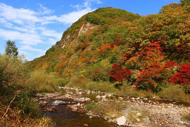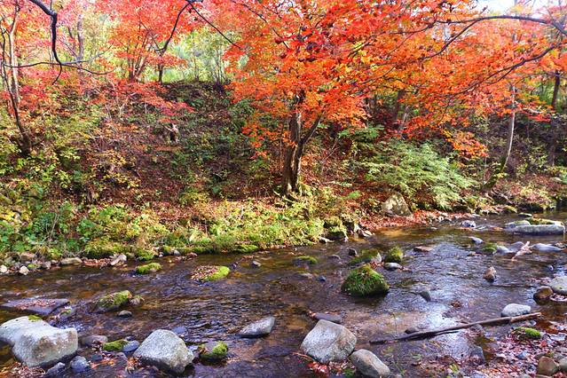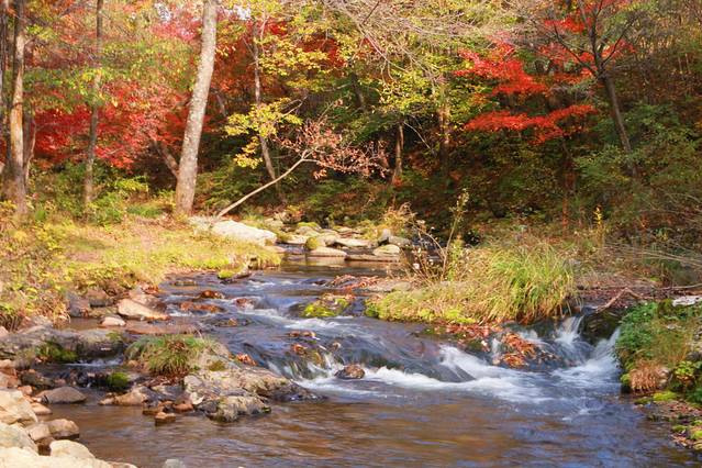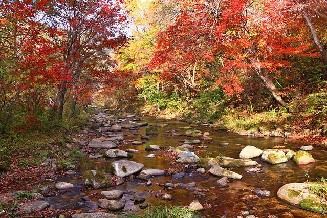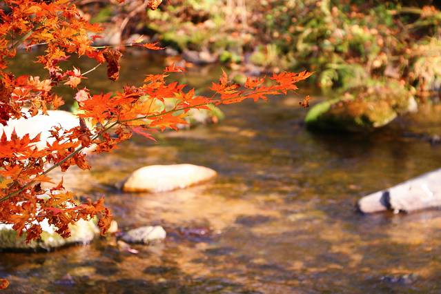 沿着本桓线两侧不仅有连绵起伏的群山,也有数不清的大河和溪流,或是相辅相成,有山的地方便有枫叶,有枫叶的地方也必有涓涓流水。