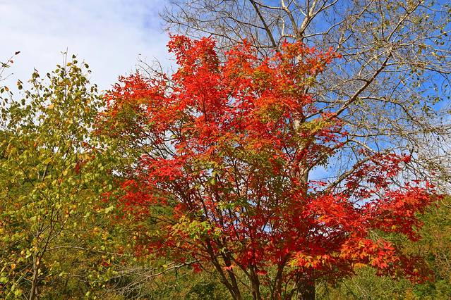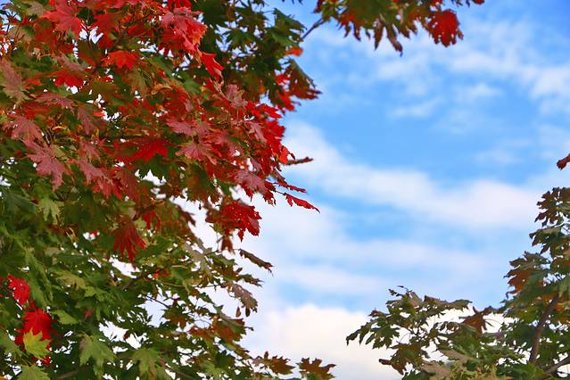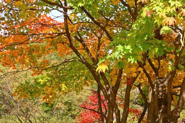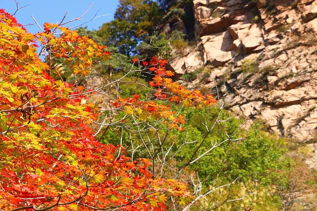 蓝天下,枫后更多的则是婀娜多姿,它的颜色不是厚重的红色,而是娇艳的黄红绿相拼,更显得靓丽多彩,同关门山的枫王相比,这里虽没有枫王大,却独具枫情。