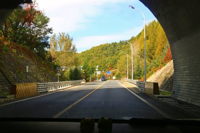当车驶过八盘岭隧道,秋的意境更浓了,山峦开始变得颜色缤纷,美不胜收起来,这篇绚烂的秋意仿佛在提醒这我们,离本桓公路赏枫叶的精华路段很近了!