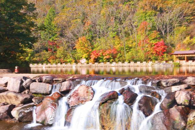 一入大石湖,整个山间秋意十足,一眼望去,更是一种秀气的美,景区里湖水、潭水、河水、瀑布与纷繁的彩林构成了一个个清新灵动的景致。
