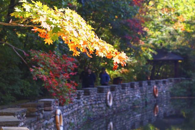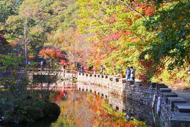 看着枫叶和溪水的一静一动让我想起了陶渊明的“醉翁之意不在酒,在乎山水之乐也”。这里的山溪分支很多,纵横交错,水不是很盛,却都清澈见底,流过村庄的门前,一些农妇在石板上洗涮衣物,生活或许正如所见那样简单而又美好。