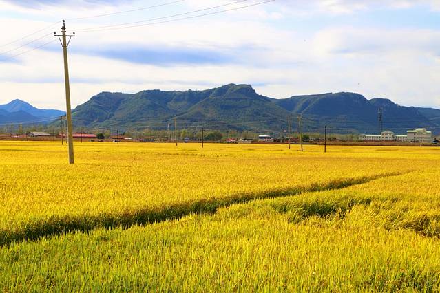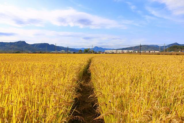 3、道路两侧都是金黄的水稻,十月上旬这里是一片金黄,如果再晚一些就会被陆续收割了。
