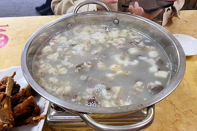 来本溪必吃没事一定少不了小市羊汤,有些人没喝过的可能不太会喜欢,小市是个地名,所以小市羊汤有很多家,最火的应该是小小羊汤,味道也是真的不错,我们到本溪和离开本溪,先后吃了两顿小小羊汤,我们俩人点的他家的炸羊排、羊杂汤、牛舌饼,三样都非常不错。