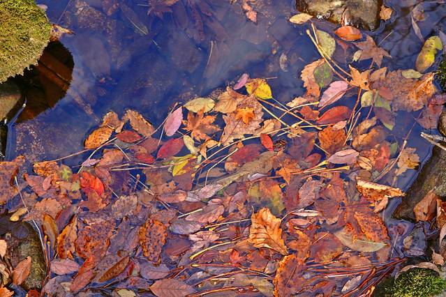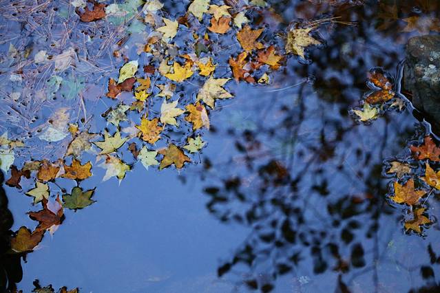 阵阵秋风,便会吹落几片绽放结束的枫叶,洒落溪水之中,随着泛起的微波逐流,在浅湾处搁浅下来。