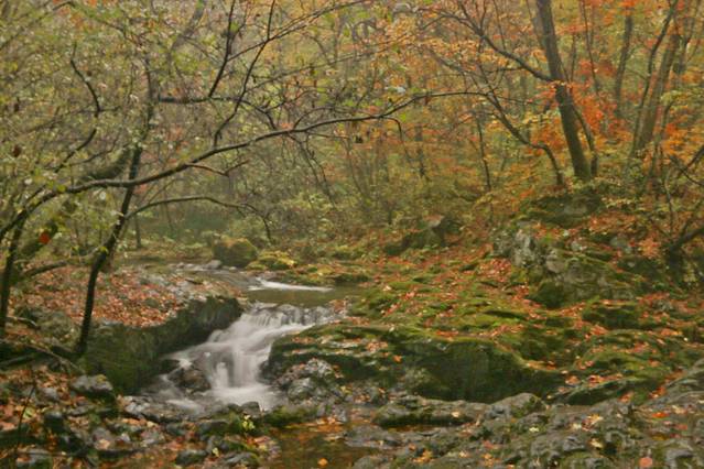 关门山本身也是由一条大峡谷构成,峡谷底部是河水,整个栈道也是沿着河水修建,一下雨,水面可达五六米宽。河水蜿蜒曲折,时阔时狭,时缓时急;红色的、黄色的落叶在水面上飘过,也会在浅湾处搁浅。