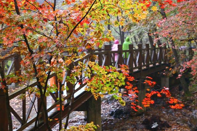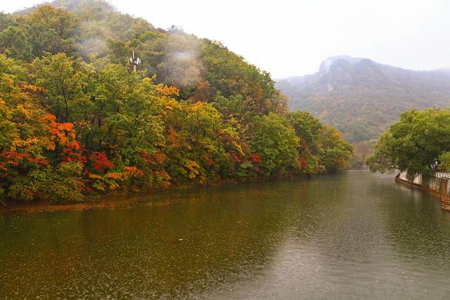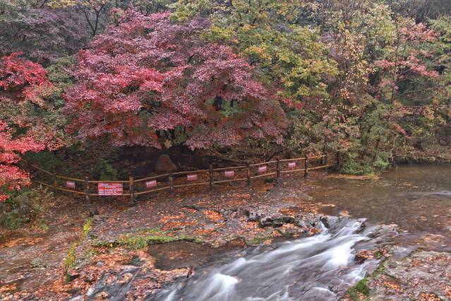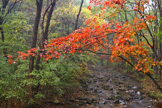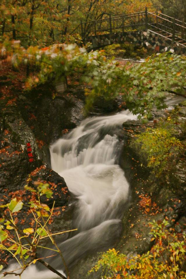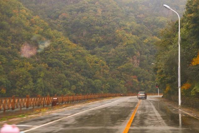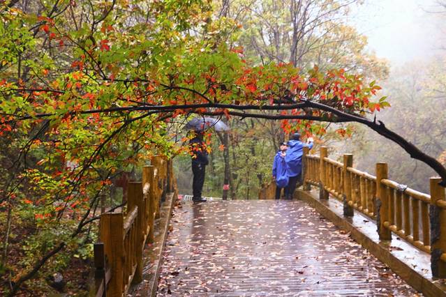 4、关门山的枫期最高应该是在十月中旬,十月一的关门山枫叶还不是最红的时候,下雨天的关门山虽然溪水会变多,景色更艳丽、更通透,但是不建议上山,亲测以后,雨衣、雨伞都不能有效防雨。